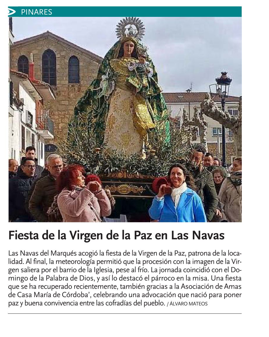 El domingo 25 de enero, unidos a las Amas de Casa, celebramos en la parroquia la fiesta de la Virgen de la Paz, patrona de nuestro pueblo. Pese al frío y la nieve, tras la Eucaristía hicimos una pequeña procesión alrededor de la Plaza Vieja. Que María, Reina de Paz nos bendiga y bendiga a nuestro pueblo y a todo el mundo, con la Paz que lleva entre sus brazos: Jesucristo.
